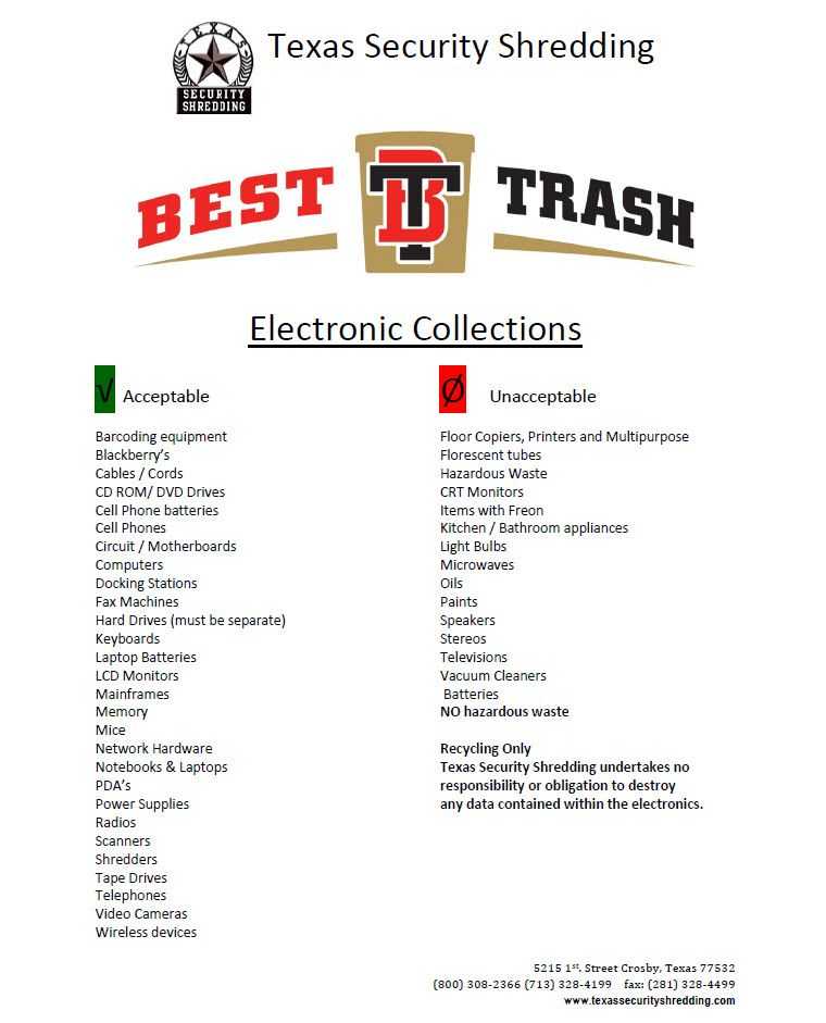 Trail of the Lakes MUD is hosting an Electronic Waste Collection and Document Shredding event on Saturday, October 19, 2024, from 10:00 a.m. to 12:00 p.m. at Humble Middle School, 11207 Will Clayton Parkway, Humble, Texas 77346.